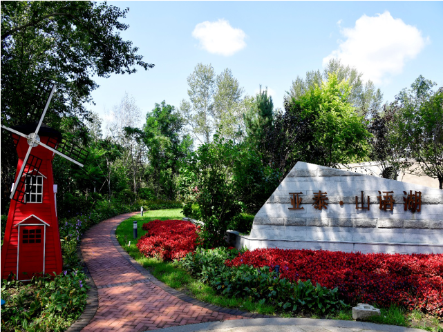 亚泰山语湖环境景观工程总施工面积14万㎡,合同额4845万元,主要包括沥青道路、烧结砖人行道路、苗木、喷灌给水、铁艺围栏和出户台阶等。园区大量种植绿化,品种丰富多达40余种,苗木选择本着适地适树的原则,以乡土苗为主,植物材料根系发达,绿化搭配层次分明,丰富饱满,树木支架整齐、美观,从而打造生态型园林系统。项目部加强质量管理,根据工程特点编制了专项施工方案并进行技术交底,施工过程进行严格细致的检查与验收,最终使得设计效果完美呈现。项目荣获“吉林省‘园林杯’优质工程”。