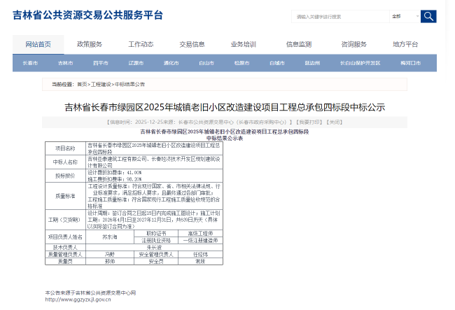 2026年,亚泰建筑通过精准调研、主动对接拓展市场、参与投标,实现优质项目承接落地、业绩提升,其参与的“吉林省长春市绿园区2025年城镇老旧小区改造建设项目工程总承包四标段”中标,作为联合体中标人,中标价4126.5792万元。